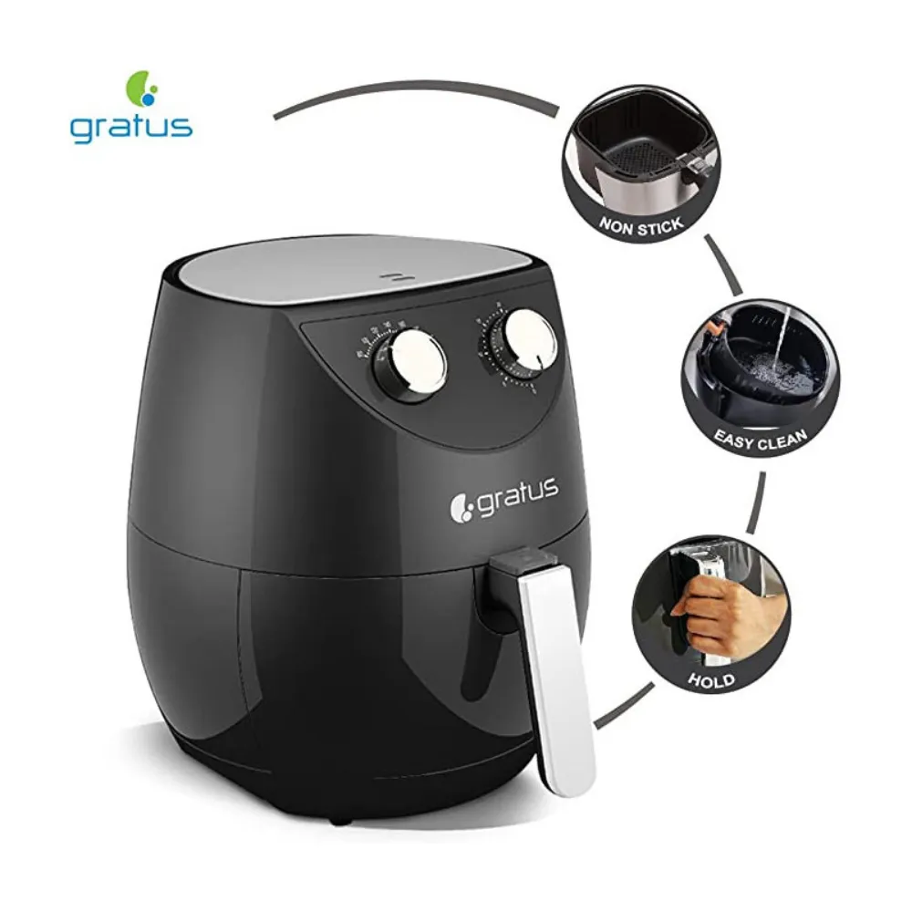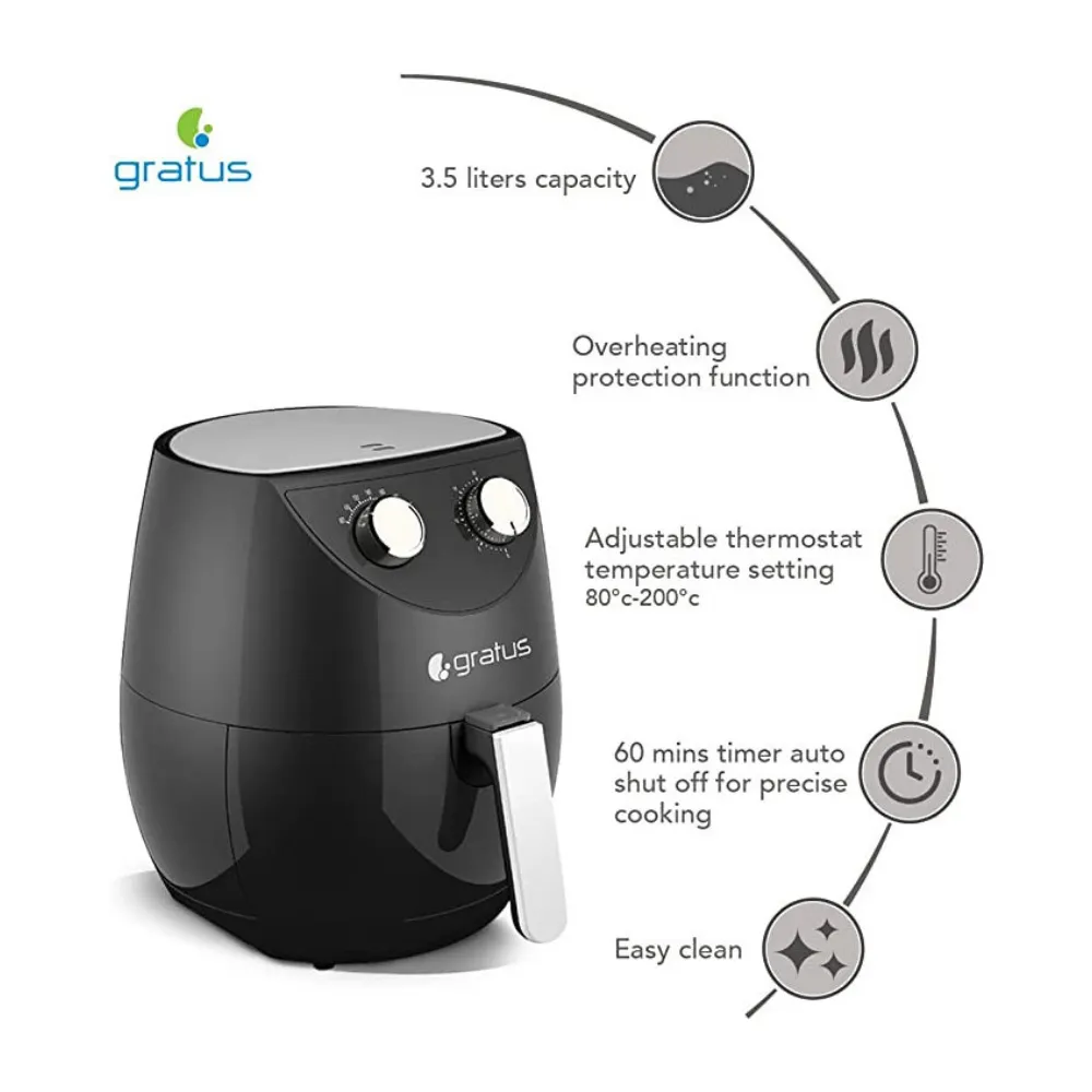 Experience the future of cooking with the Gratus 3.5L Air Fryer, featuring a powerful 1500W motor, sleek Black & Silver design, and a generous 3.5-liter capacity. Cook your favorite fried foods with up to 80% less oil, thanks to advanced air frying technology.