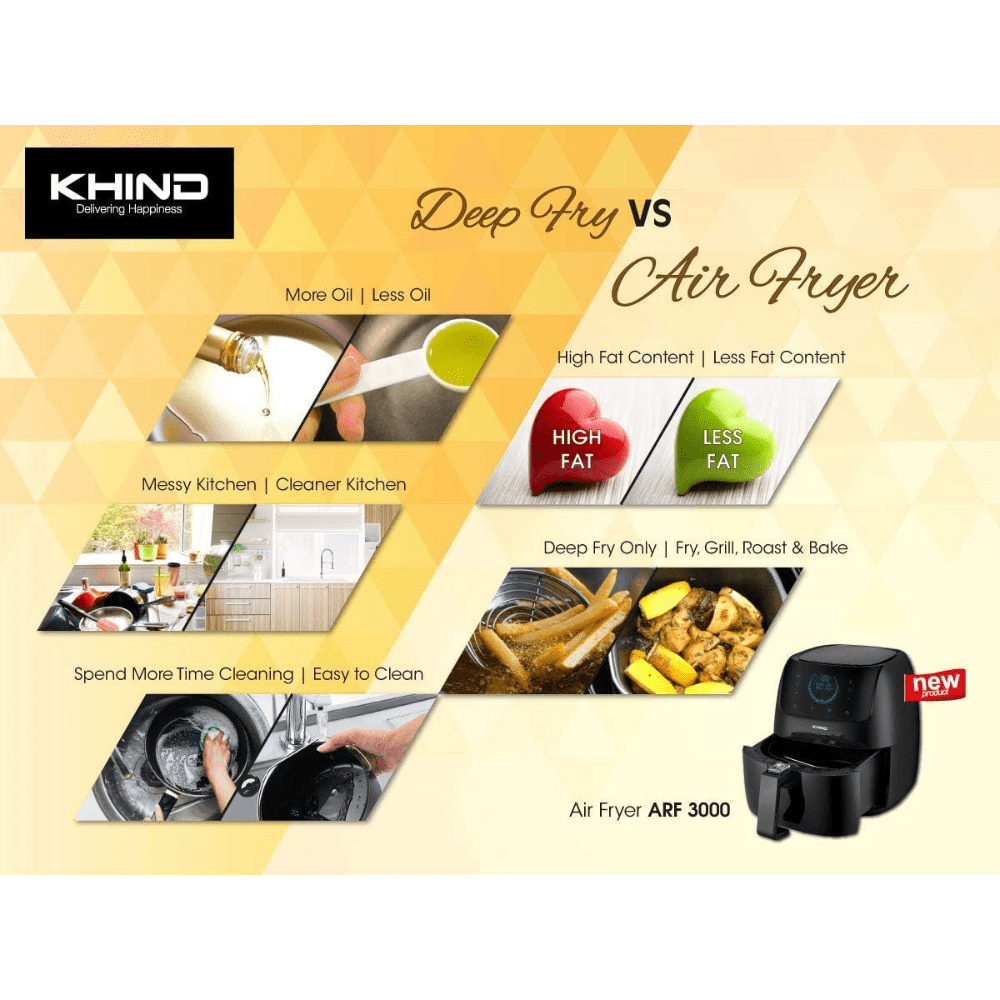 Be the first to review “KHIND Air Fryer ARF3000, Digital Display with Touch Control, 3.5L Net Capacity, 8 Preset Menus, Variable Temperature and Timer, Food SS Grill, Low Fat Cooking- Black”