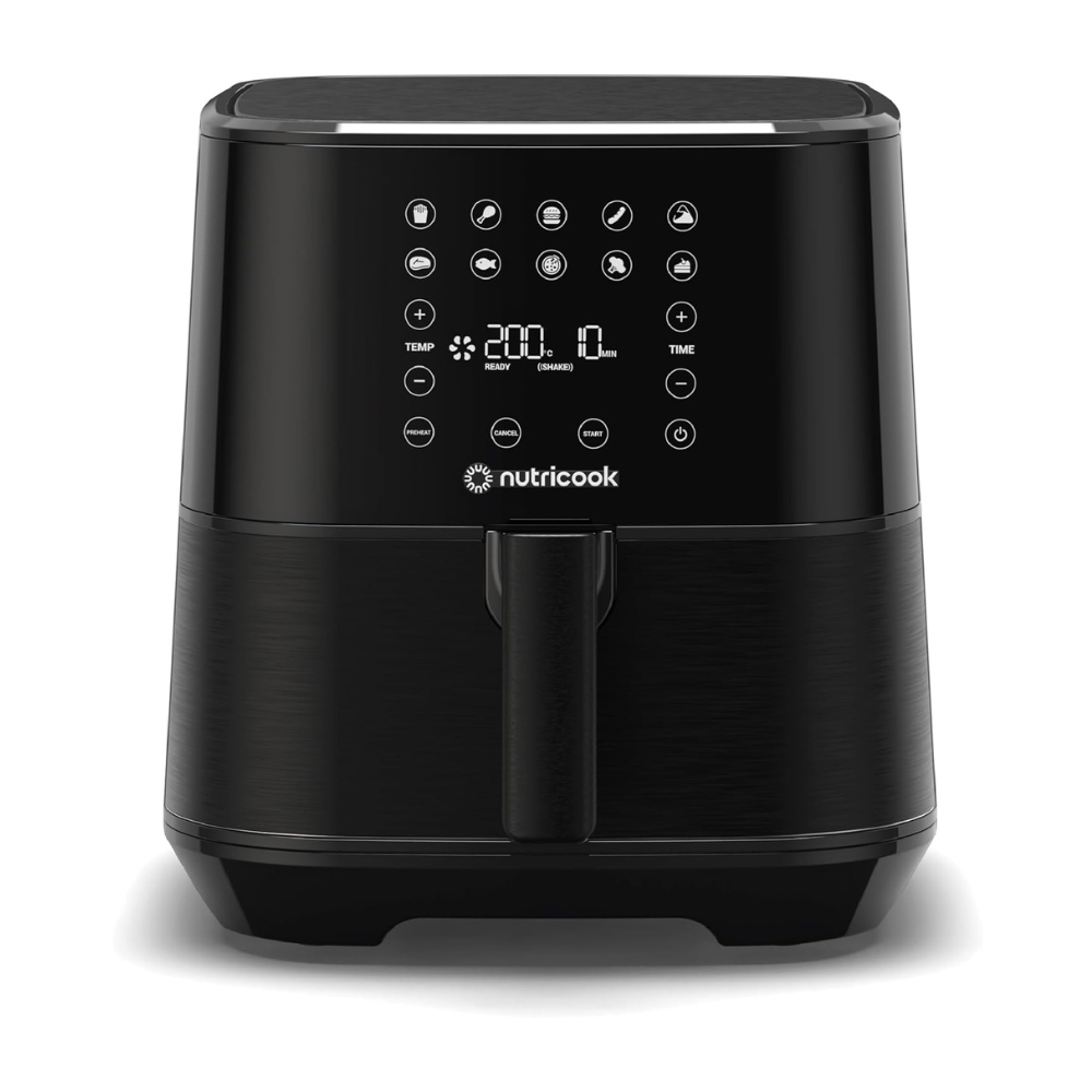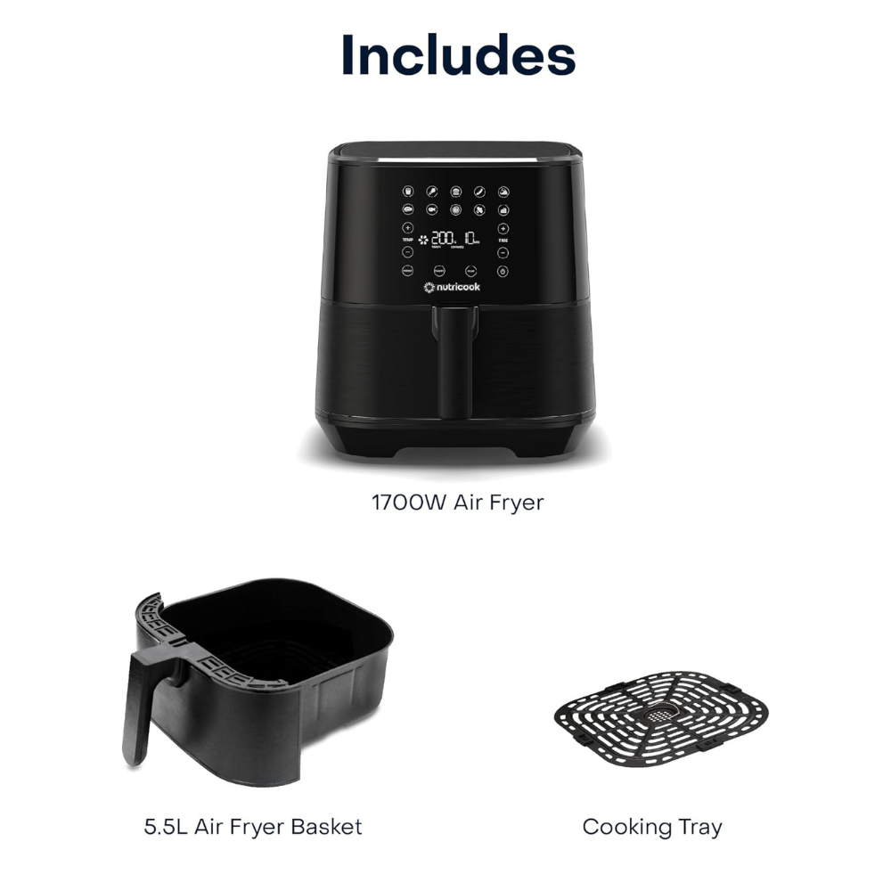 The Nutricook Air Fryer 2 is the ultimate kitchen appliance, designed to deliver healthier and faster cooking with its 1700-watt power. Featuring a spacious 5.5-liter capacity, this air fryer allows you to prepare meals for the entire family in one go. Equipped with a user-friendly digital control panel, it offers 10 preset programs for frying, baking, roasting, and more, making cooking simple and convenient. Its built-in preheat function ensures precise cooking temperatures for consistently delicious results. The sleek black finish adds a modern touch to any kitchen, and the product comes with a minimum 1-year manufacturer warranty for peace of mind.