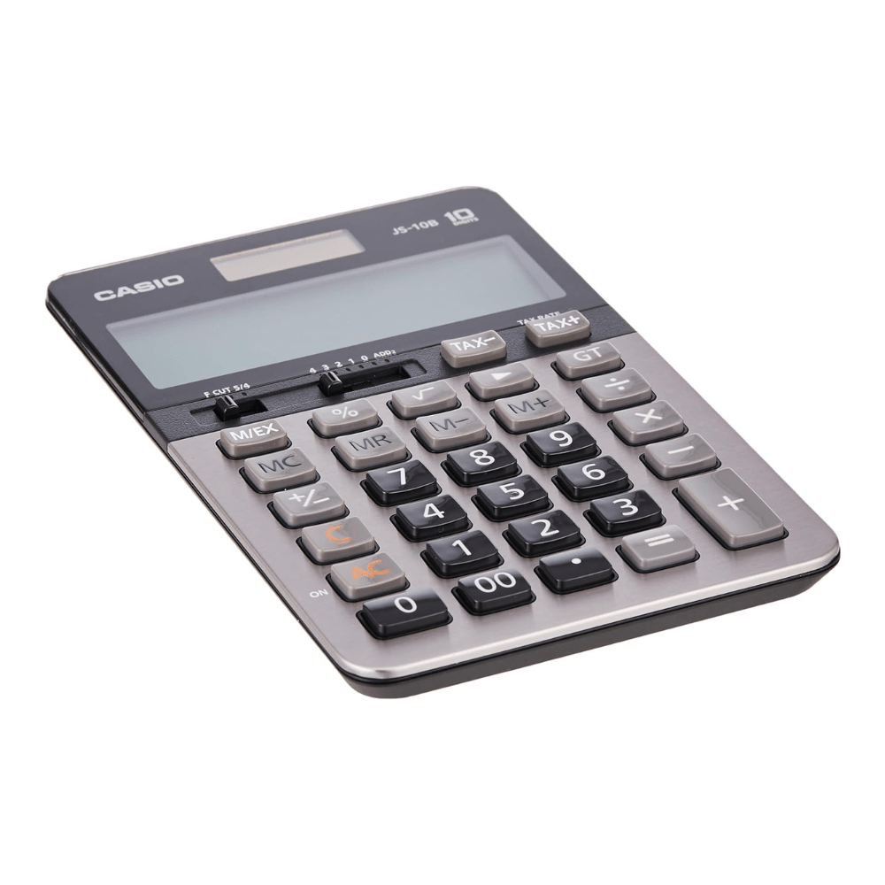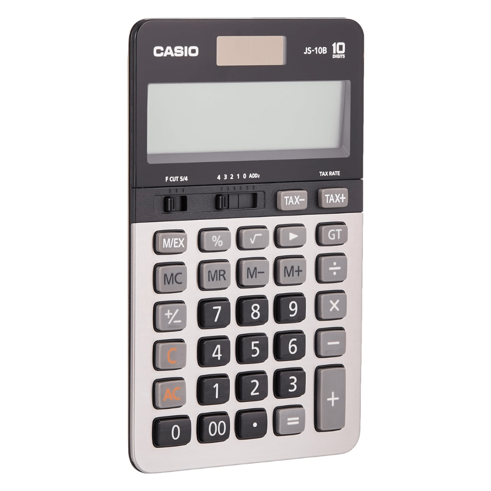 The Casio JS-10B Calculator is a compact desk-type model with a 10-digit display. It excels in various financial calculations, offering automatic tax calculations for price plus tax, price less tax, discounts, selling prices, tax amounts, discount amounts, and margins. Additionally, it provides convenient currency conversion functionality.