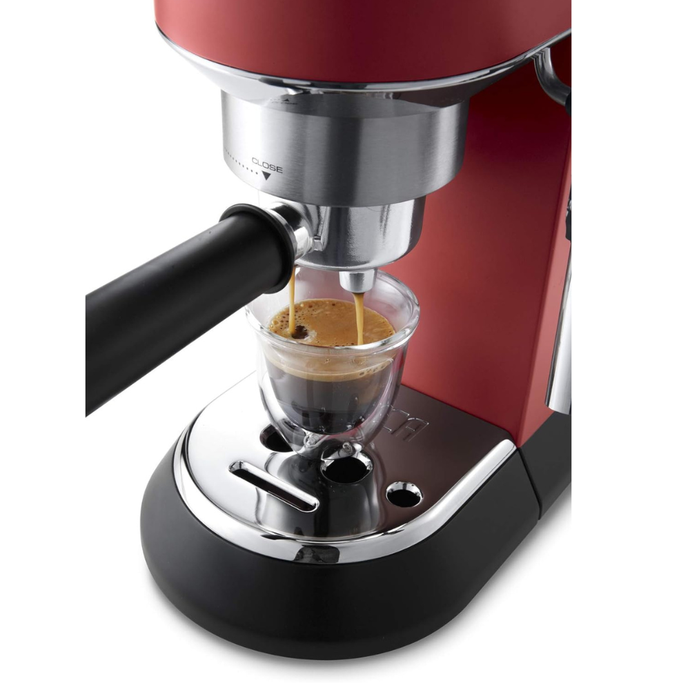 The De’Longhi Dedica Style Pump Espresso Machine in striking red, model EC685.R, embodies the epitome of coffee craftsmanship. Crafted by DeLonghi, this international espresso machine offers an exquisite blend of design and functionality. With compact dimensions measuring 7.9D x 15.2W x 14.1H centimeters, it’s designed to fit seamlessly into any kitchen space without compromising performance.