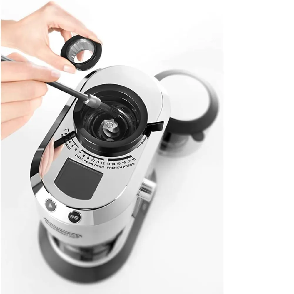 The Dedica Pump Style Coffee Grinder is renowned for its sleek design and exceptional performance. Crafted by De’Longhi, a brand synonymous with quality coffee appliances, this grinder stands out among the best.