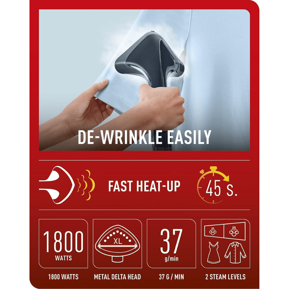 Powered by 1800 watts, it boasts a continuous steam output of 37g/minute, ensuring effective and efficient steaming sessions. Experience rapid heat-up in just 45 seconds, allowing for swift usage without prolonged waiting times. The removable 1.5-liter water tank adds to its user-friendly design, enhancing convenience during extended steaming sessions.