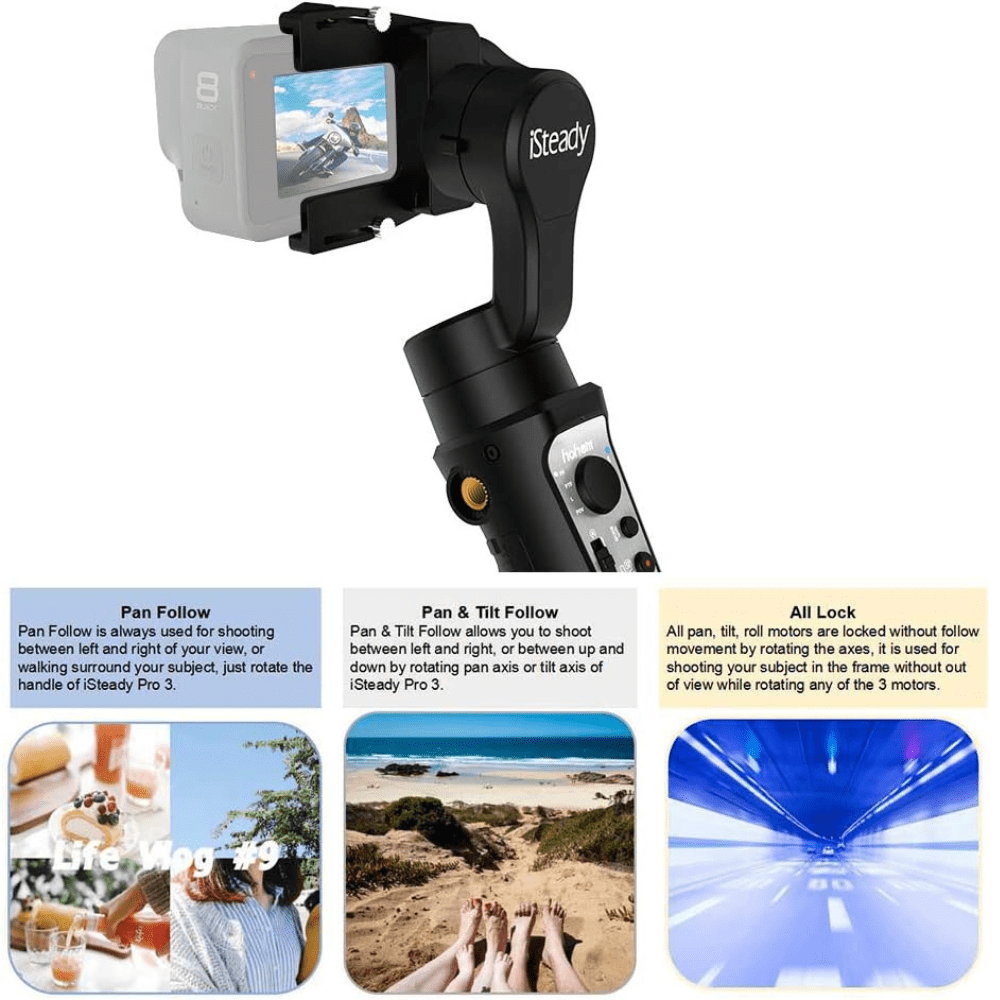 The JJmooer iSteady Pro 3 Handheld 3-Axis Camera Gimbal Stabilizer, featuring IPX4 splash-proofing and a tripod stand, offers seamless functionality. Compatible with GoPro Hero 8/7/6/5/4/3 series sports cameras, it ensures stable and smooth footage.