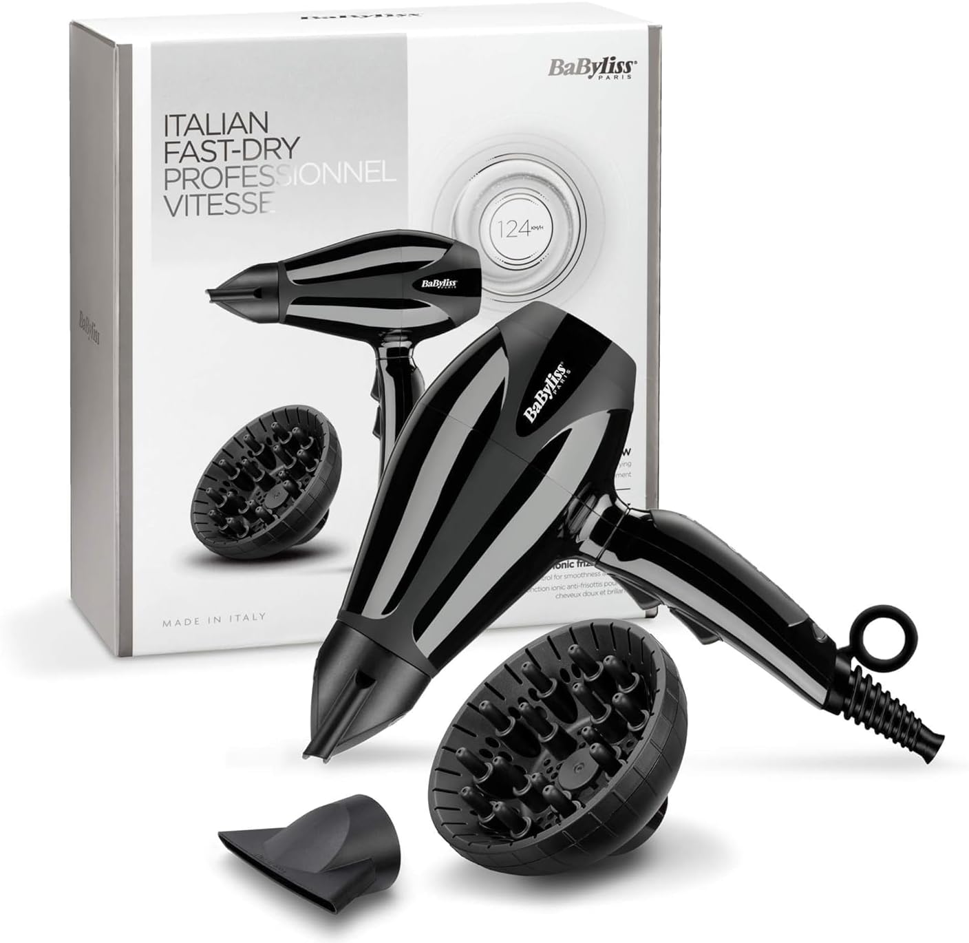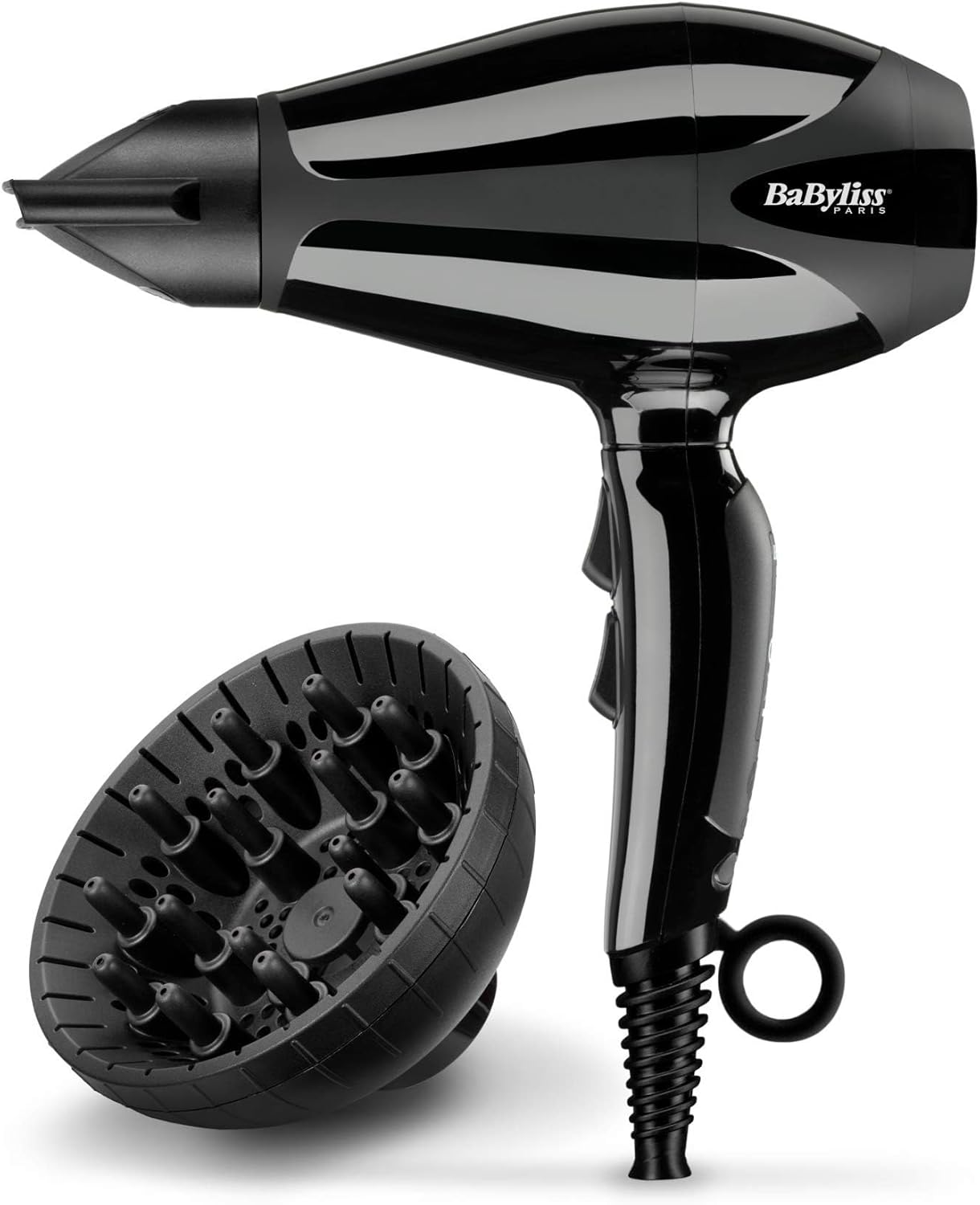 BaByliss Compact Pro 2400 ​Hair Dryer AC, Italian Made For Quality & Long-lasting Performance, Ultra-slim Nozzle With Ionic Frizz Control Technology, Portable Dryer With Diffuser, 6715DSDE (Black)