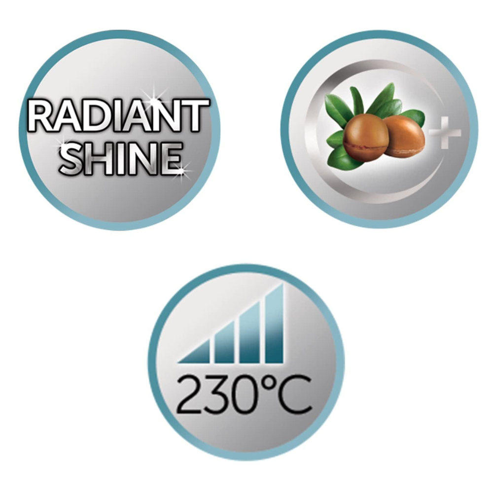 The REMINGTON Shine Therapy Straightener features advanced ceramic-coated plates infused with Moroccan Argan Oil, known for its moisturizing and nourishing properties. This innovative technology helps to condition and protect your hair while you style, leaving it feeling soft, silky, and frizz-free.