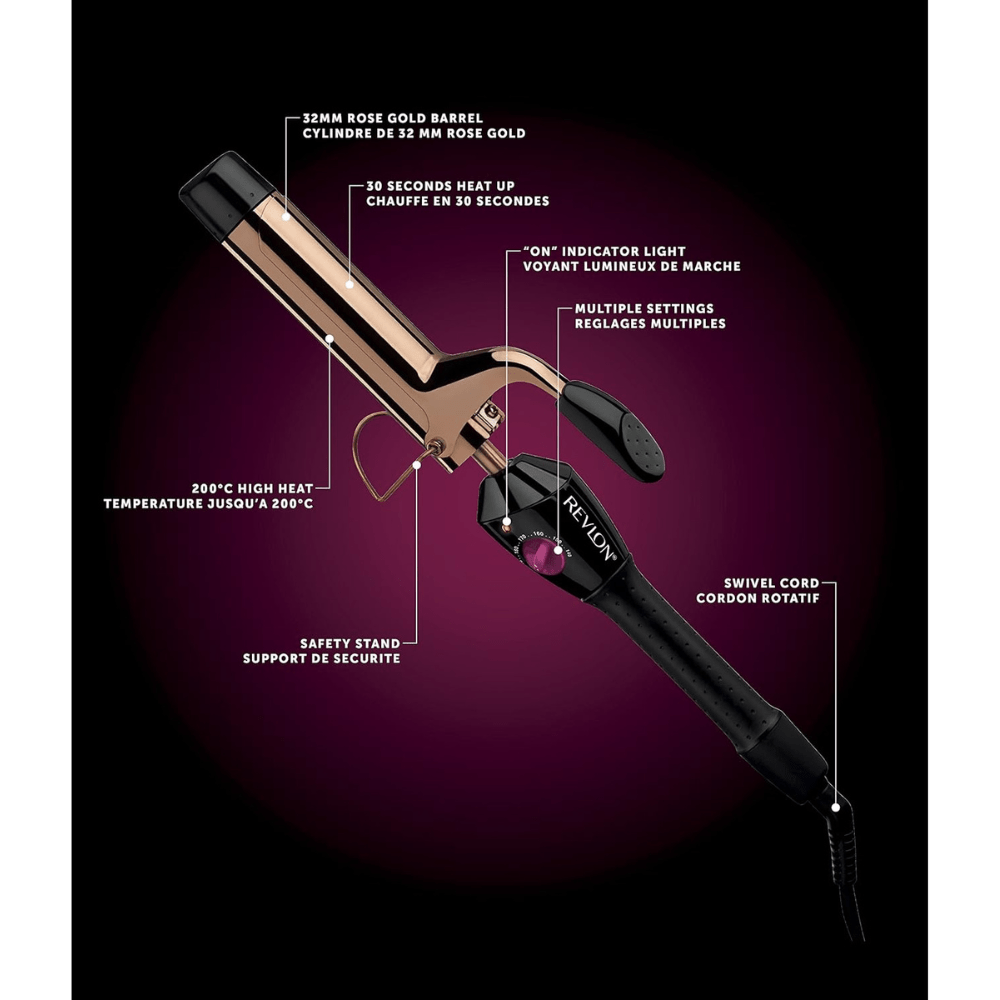 The Revlon Pro Collection Rose Gold Curling Iron in 32mm presents a fusion of cutting-edge technology and elegant design, providing the ultimate solution for achieving stunning curls. Crafted by Revlon, this curling iron, with its sleek black color and rose gold accents, epitomizes sophistication and functionality in one stylish package.