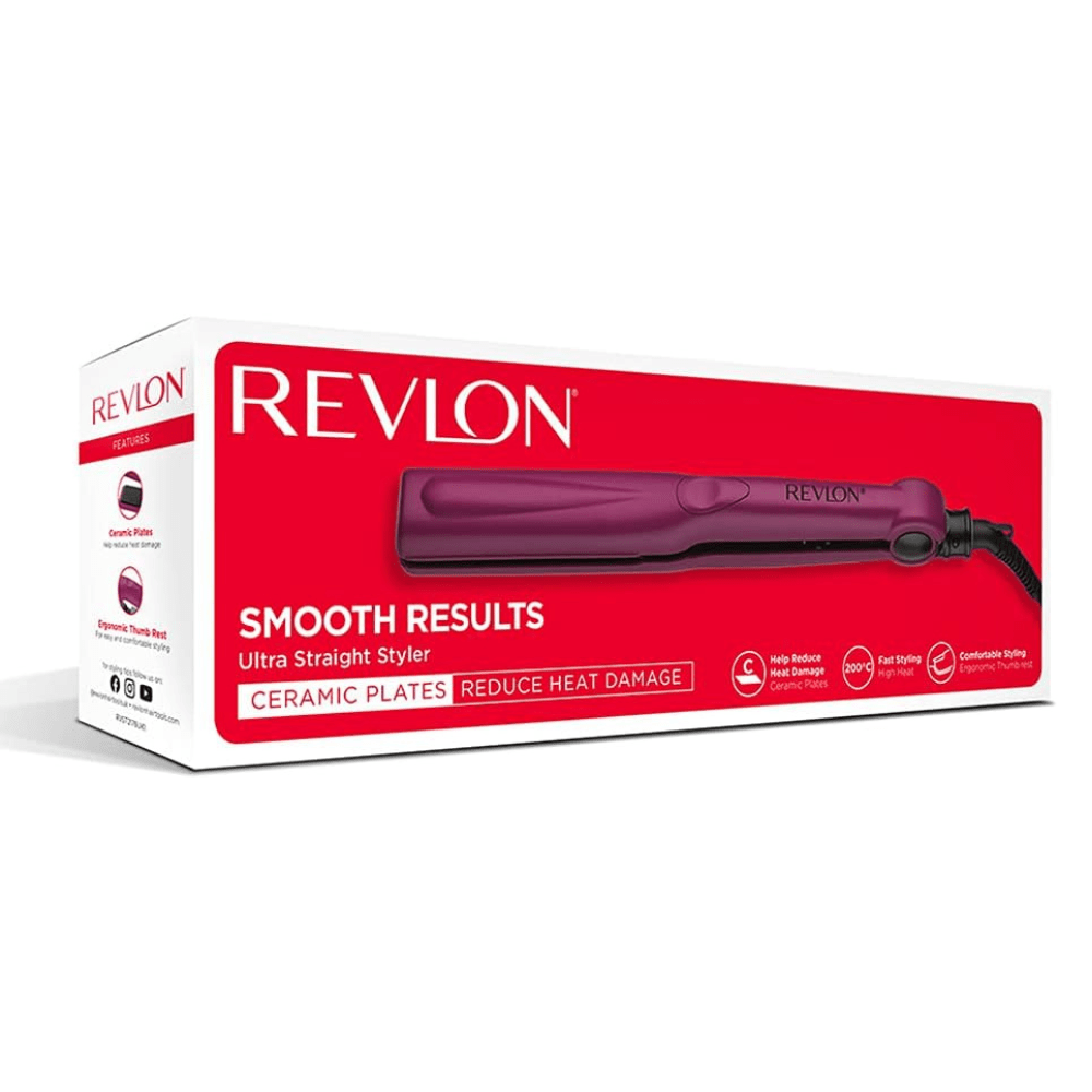 Revlon’s RVST2176 Ceramic Ultra Straight Hair Straightener in a vibrant pink color is designed to prioritize hair health while delivering exceptional styling results. Featuring ceramic plates for even heat distribution, ergonomic design, high heat capability, tangle-free swivel cord, and quick readiness in 60 seconds.
