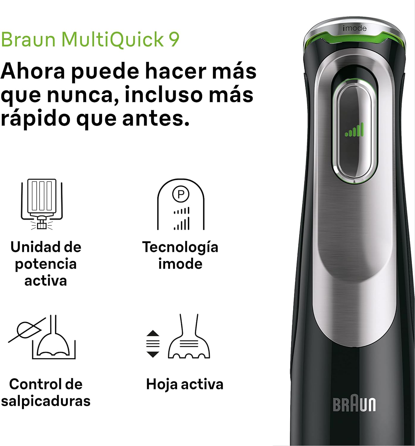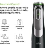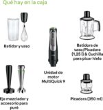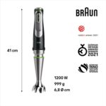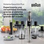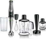 Braun Hand Blender Set Seamless variable speed from low to high Child safety lock with power indicator Stainless steel blades 1.2 m cord length Beaker 600 ml Stainless steel whisk Purée / masher accessory Chopper 350 ml with ice crushing knife Chopper / Blender 1.25 l with ice crushing knife and blending knife.