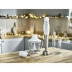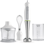 The blender comes equipped with a stainless steel whisk, a 0.5L beaker, and a 0.5L chopper, offering versatile functionality to suit a range of food preparation needs. The textured grip handle ensures a comfortable and secure hold, making it easy to maneuver and handle while blending your ingredients.