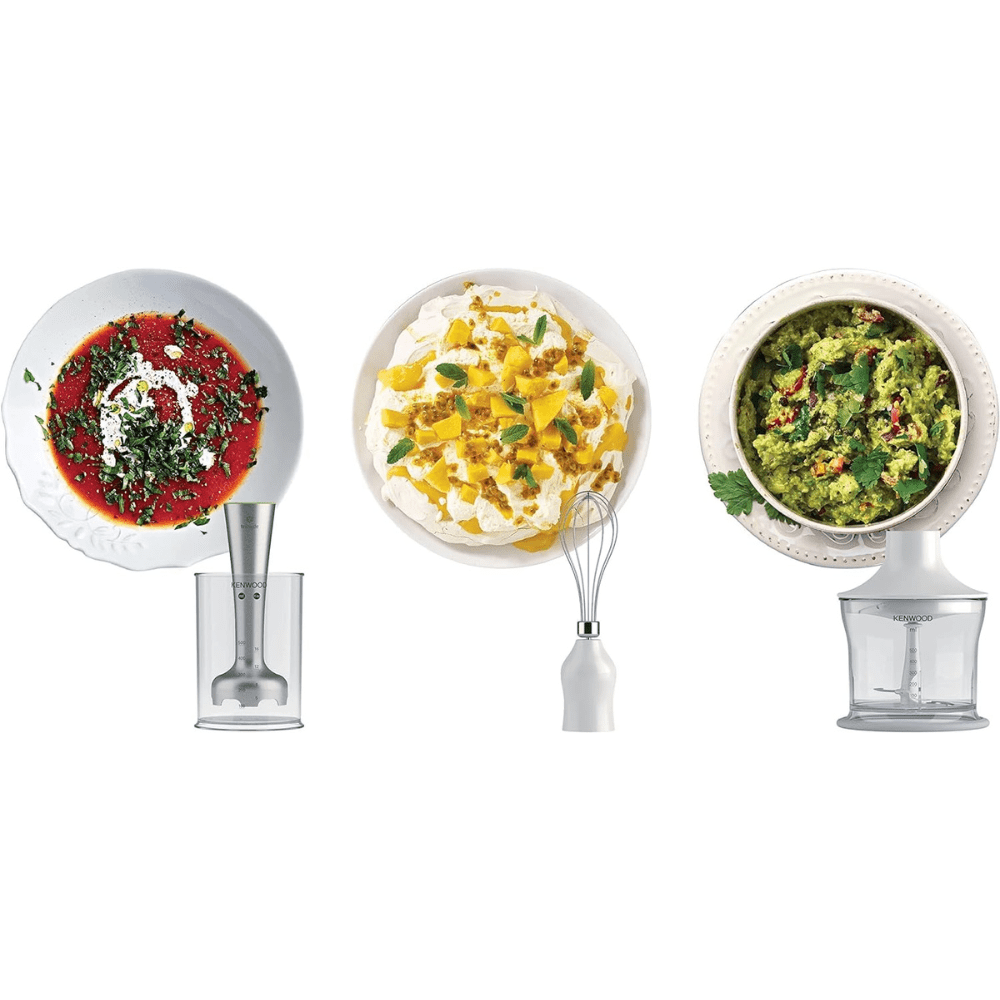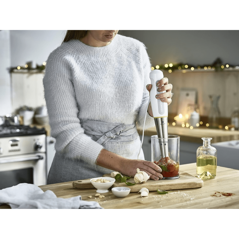 The KENWOOD Hand Blender HDP109WG in White boasts a powerful 600W motor for effortless blending. This versatile kitchen tool includes a stainless steel whisk, a 0.5L beaker, and a 0.5L chopper. Its textured grip handle ensures comfortable use, while the metal Triblade blending wand, featuring a patented three-angled blade system, guarantees exceptional blending performance for a wide array of ingredients and recipes.