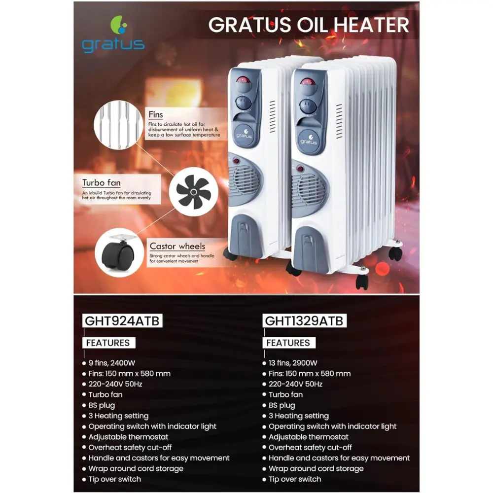 Introducing the GRATUS 13 Fins Oil Heater, a powerful and efficient heating solution designed to bring warmth and comfort to your home during the colder seasons. The GHT1329ATB model stands out with its impressive features, providing a perfect balance of performance and affordability.