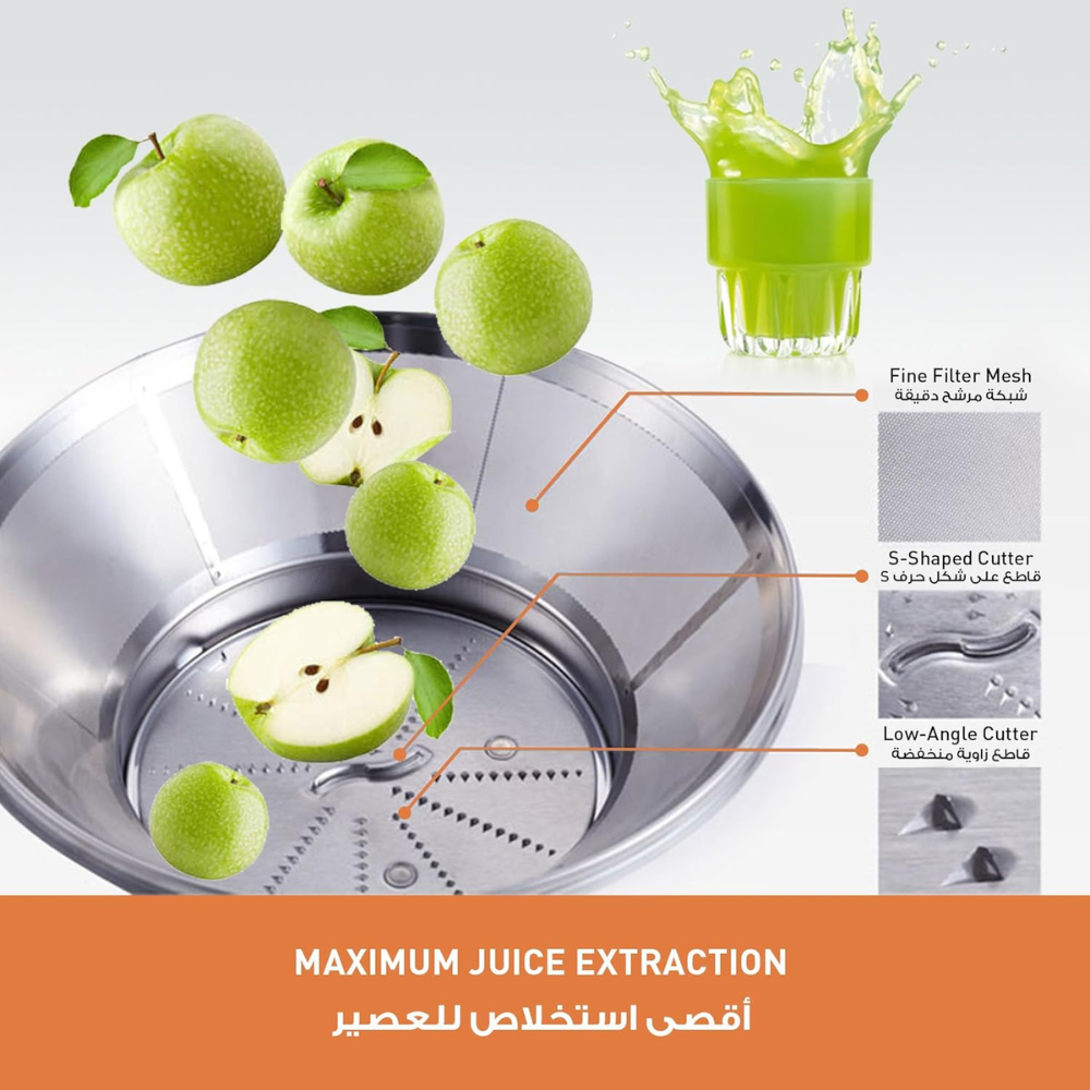 • S-Shaped Cutter & Low-Angle Blade ensures thorough extraction from fruit cores