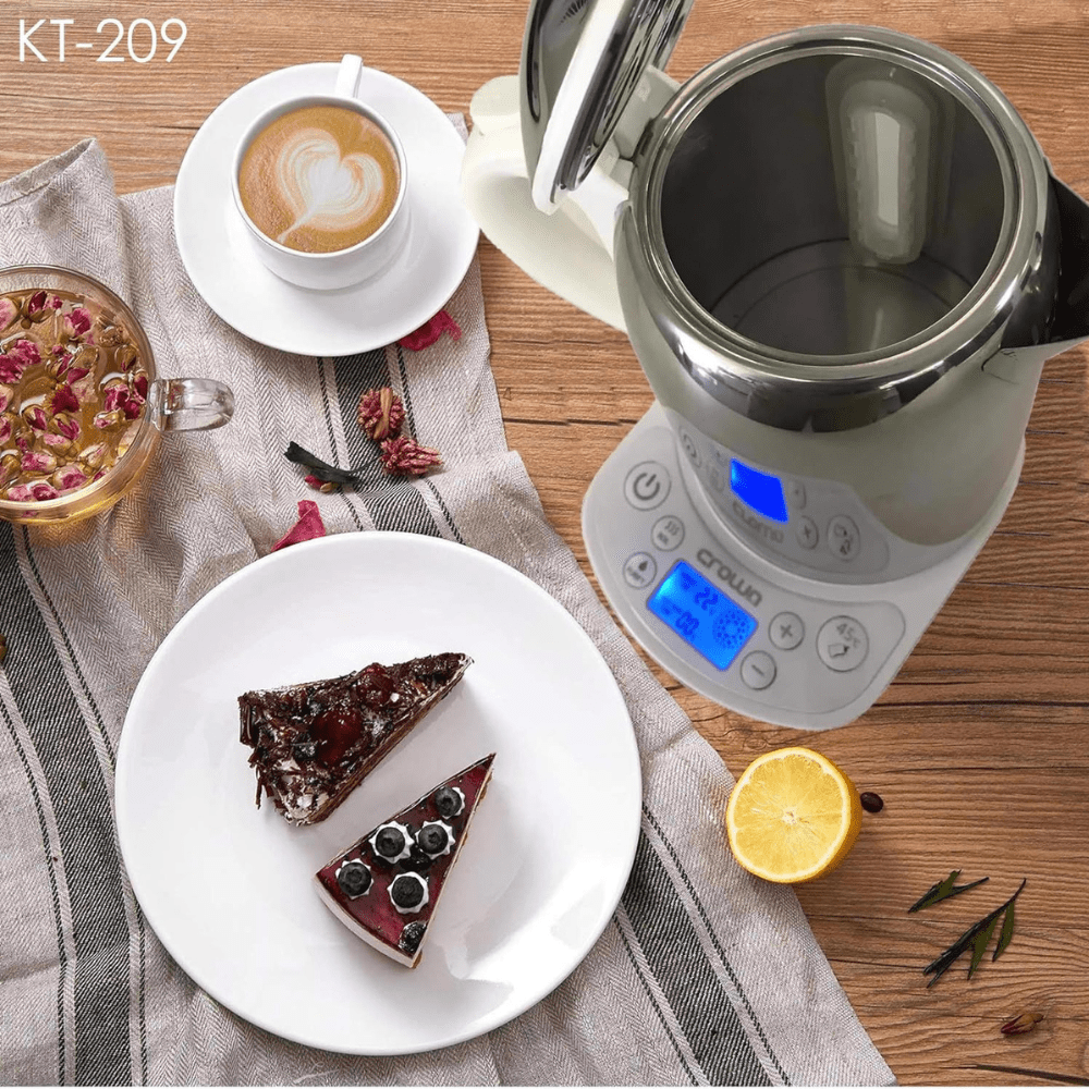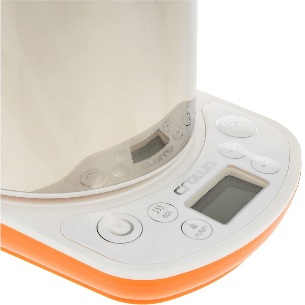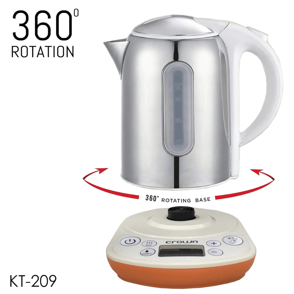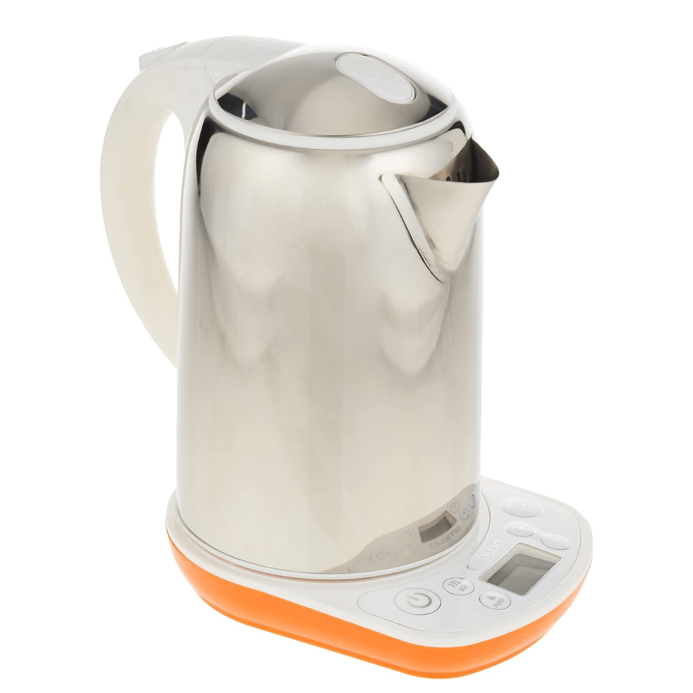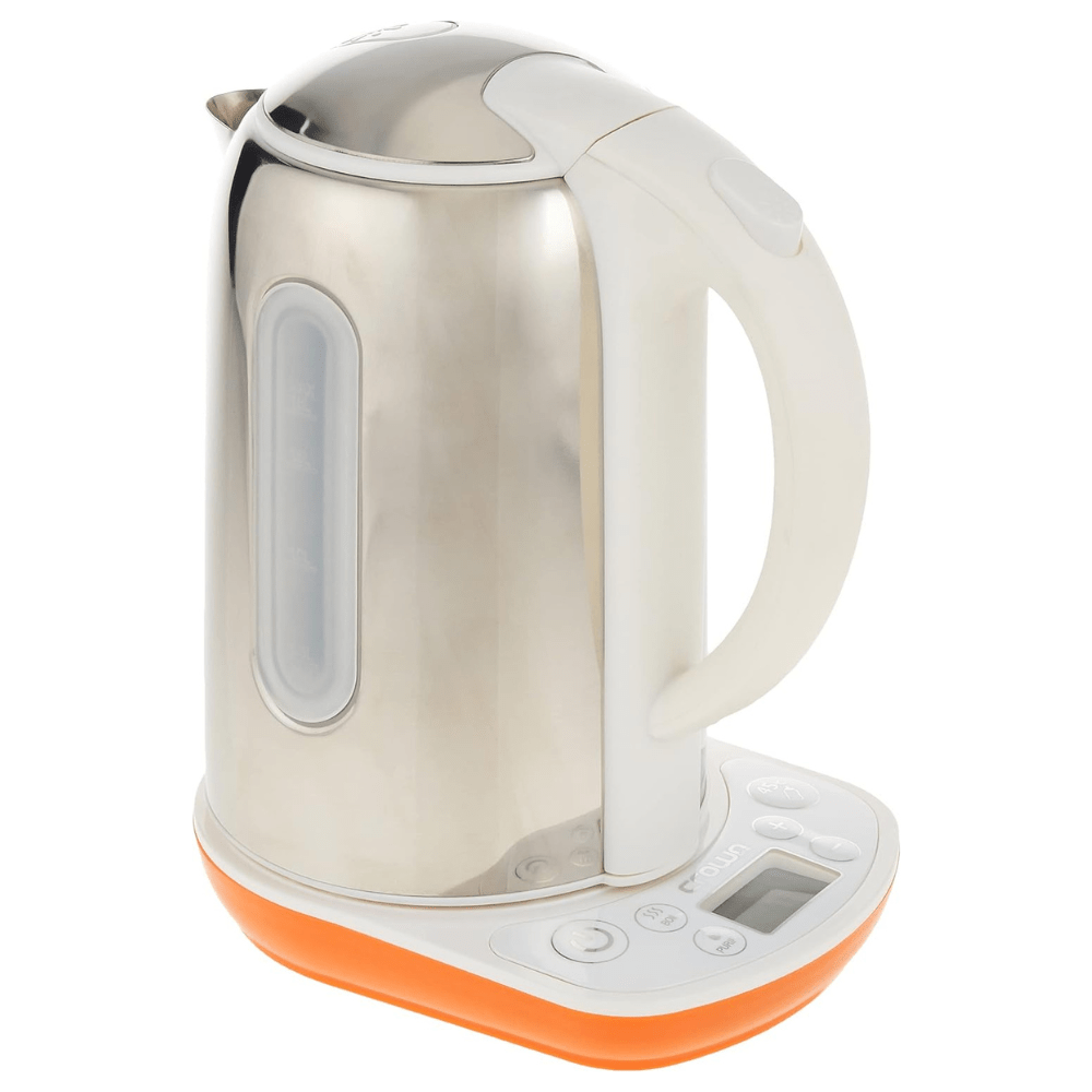 The Crownline KT-209 Cordless Kettle in a striking silver and orange design boasts a 1.8L capacity and a stainless steel body. Featuring temperature control, water purify function, and automatic keep-warm, this kettle offers precise brewing options for various beverages.