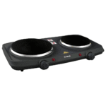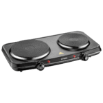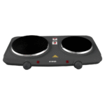 The KHIND Double Electric Hot Plate in black with two cast iron plates offers a total power of 1500W + 1000W for faster cooking. It features a variable temperature controller, decorative chrome rim, anti-skid base, thermal safety fuse, pilot indicator, and bakelite knob for easy control. Backed by a 1-year warranty, it ensures reliable and versatile cooking options.