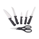 The Prestige Kitchen Knife Block Set (Model: PR50919) in black and yellow comprises seven essential pieces crafted with durable stainless steel blades and serrated edges. This set includes an 8″ Chef’s Knife, 8″ Bread Knife, 8″ Slicing Knife, 5″ Utility Knife, 3″ Paring Knife, and a Kitchen Scissor, all neatly stored in a stylish knife block. Perfect for various cutting needs, this set is a must-have for both amateur chefs and cooking enthusiasts seeking precision and versatility in the kitchen.