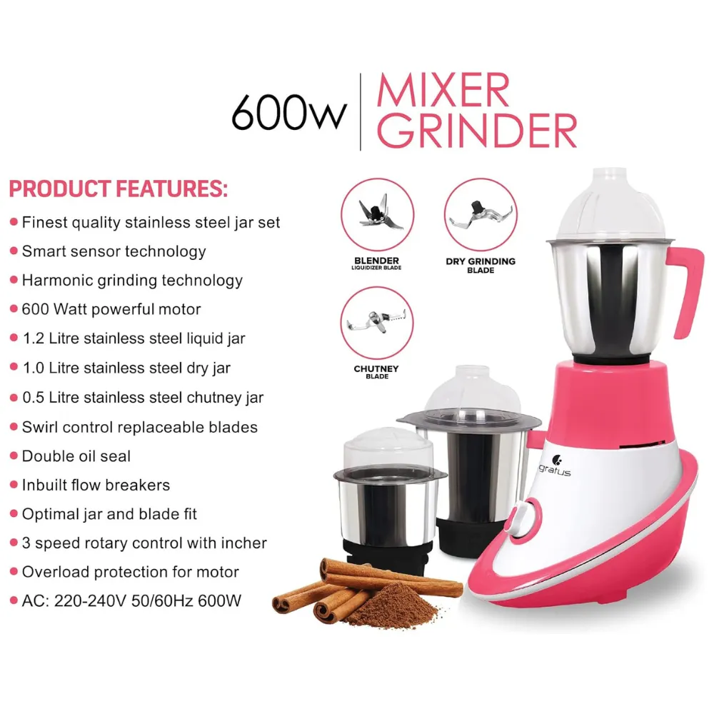 Gratus presents the 600Watts 6503TI Mixer Grinder, a powerful kitchen companion with a robust Copper Motor and three strong steel jars. Designed with Smart Sensor Technology and Harmonic Grinding Technology, this mixer grinder offers versatile performance.