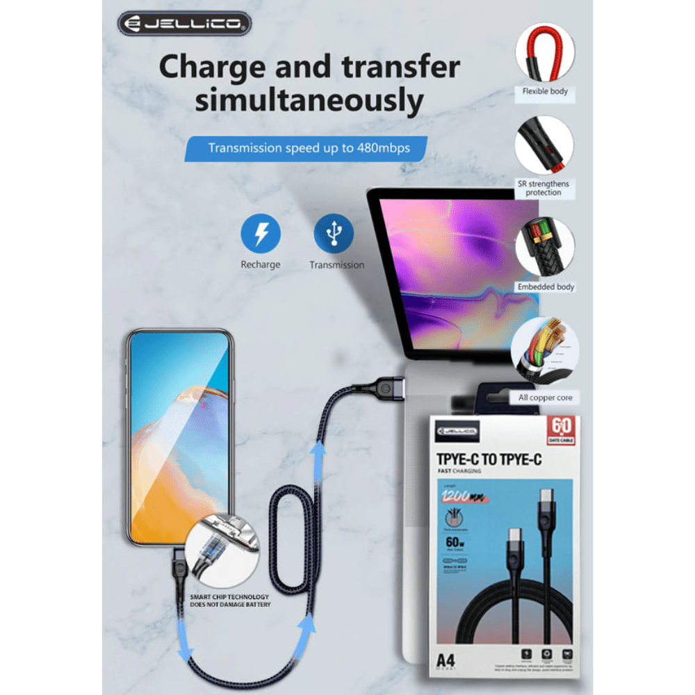 Introducing the Jellico Type-C to Type-C A4 Fast Charging Data Cable, a cutting-edge accessory designed for seamless connectivity and rapid charging. This 1200mm cable from Jellico ensures swift and efficient power delivery between USB Type-C compatible devices. With a maximum output of 60W, this cable stands out as a reliable and high-speed charging solution, allowing you to power up your devices rapidly and conveniently.