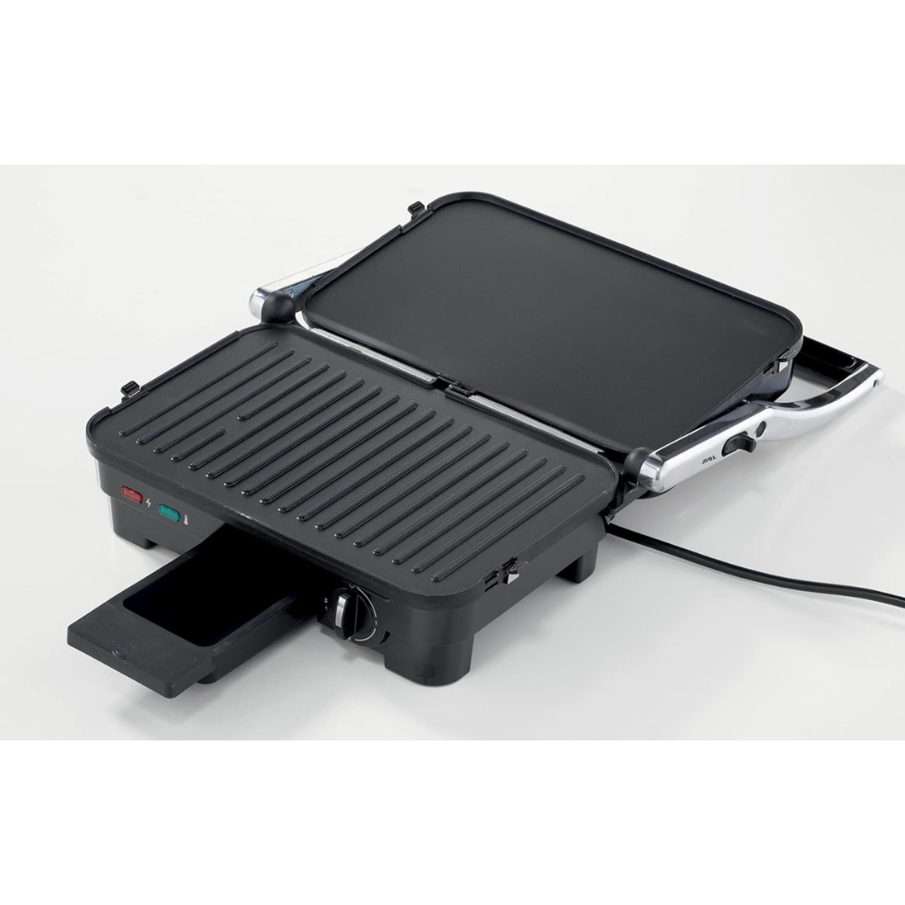 Designed for convenience, this health grill comes equipped with removable plates, facilitating easy cleaning. The dishwasher-safe parts streamline maintenance, ensuring that your focus remains on creating delicious, healthy meals.The ‘power on’ and ‘ready’ light indicators, coupled with thermostatic control, provide visual cues for optimal cooking conditions. The solid cast aluminum grill plates guarantee the best heat transmission, ensuring perfect and even cooking every time you use the grill.Noteworthy features of the HGM50.000Si include an open flat large grill area, double-sided grilling capability, and push buttons for easy grill plate release. The inclusion of oil drain channels, spatula, oil drip cups, and cord storage adds further practicality to the grill, enhancing your overall grilling experience.