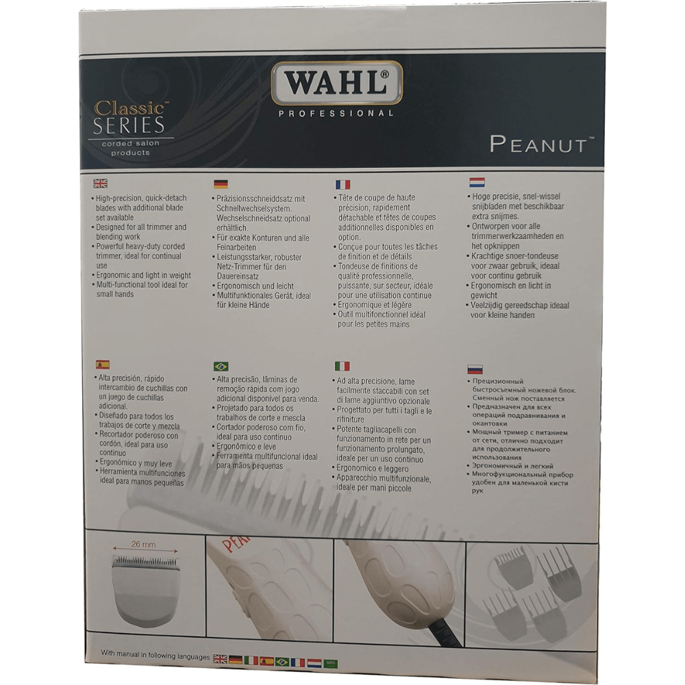 The Wahl 8655-916 Classic Series Peanut Professional Corded Trimmer in a sleek white design is an essential grooming tool ideal for both clipping and trimming needs. Crafted by Wahl, a renowned brand in grooming technology, this trimmer embodies versatility, convenience, and power.