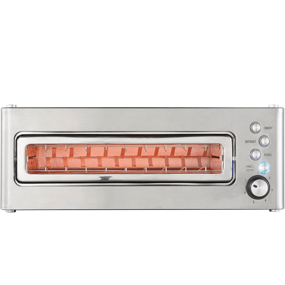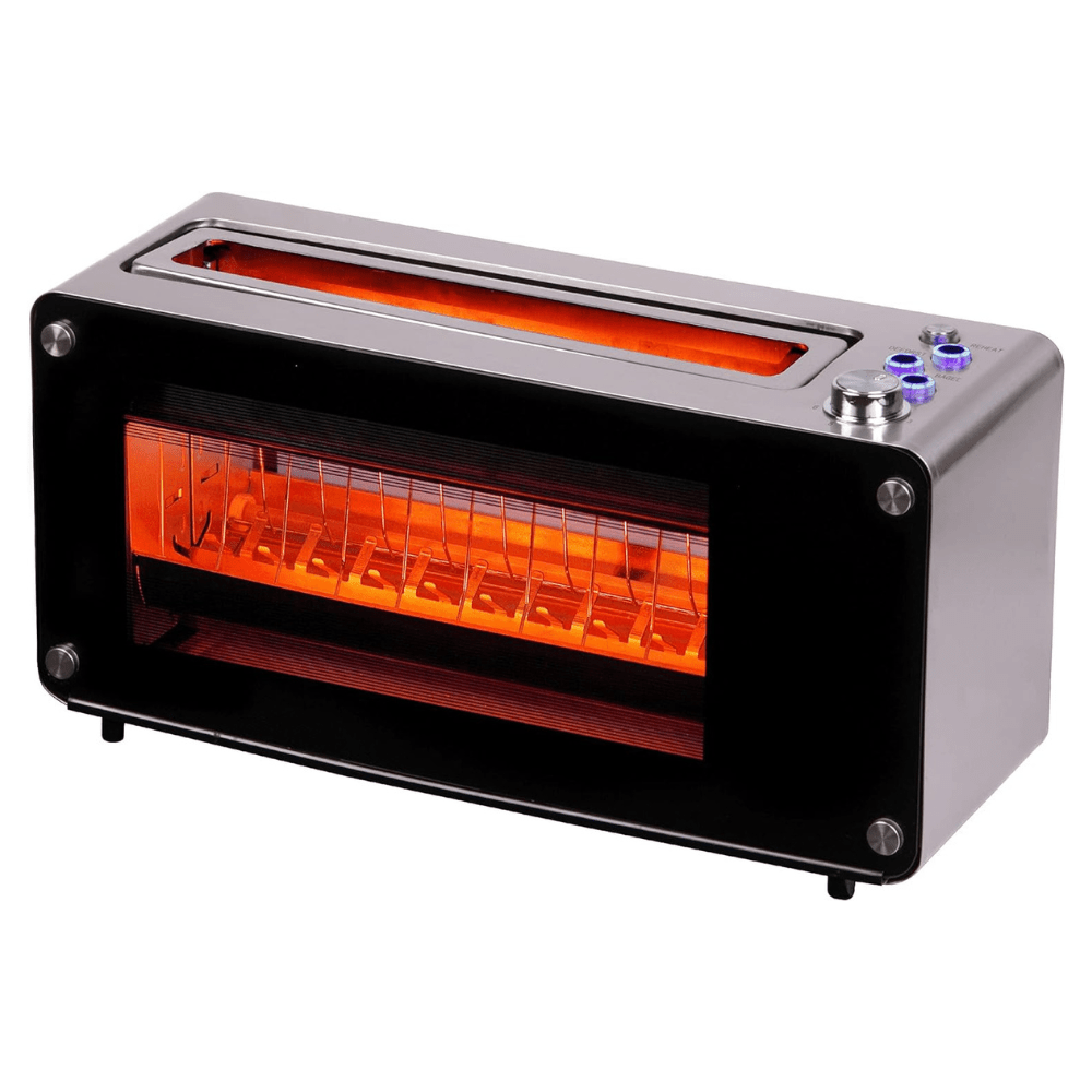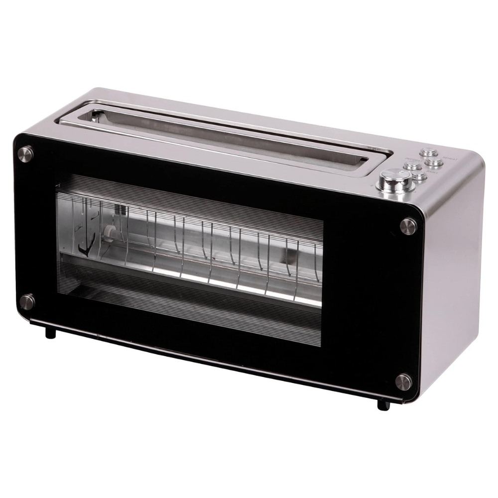 The Crownline Toaster (TR-274) in Black boasts a 2-slice long slot design with high-quality stainless steel housing and a glass viewing window. With automatic lifting, multiple settings, and easy-to-clean features, it offers versatile toasting options for various bread types and sizes.