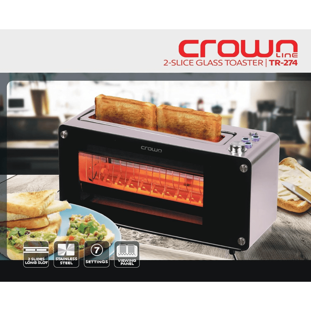 The Crownline Toaster in Black (TR-274) combines style and functionality to elevate your toasting experience. Crafted with a high-quality stainless steel housing and a sleek glass viewing window, this toaster offers a modern aesthetic that complements any kitchen decor. Its 2-slice long slot design accommodates various bread sizes and types, ensuring versatility in toasting preferences. The automatic lifting function ensures effortless retrieval of toast once ready. With dedicated settings for defrosting and bagels, as well as 7 adjustable browning levels, this toaster caters to individual taste preferences, delivering perfect results every time. For added convenience, it features a removable crumb tray and a slide-out glass panel, making it easy to clean and maintain. Operating at a voltage of 220-240V with a power range of 1000-1260W and a frequency of 50/60Hz, this toaster guarantees efficient performance for your daily toasting needs.